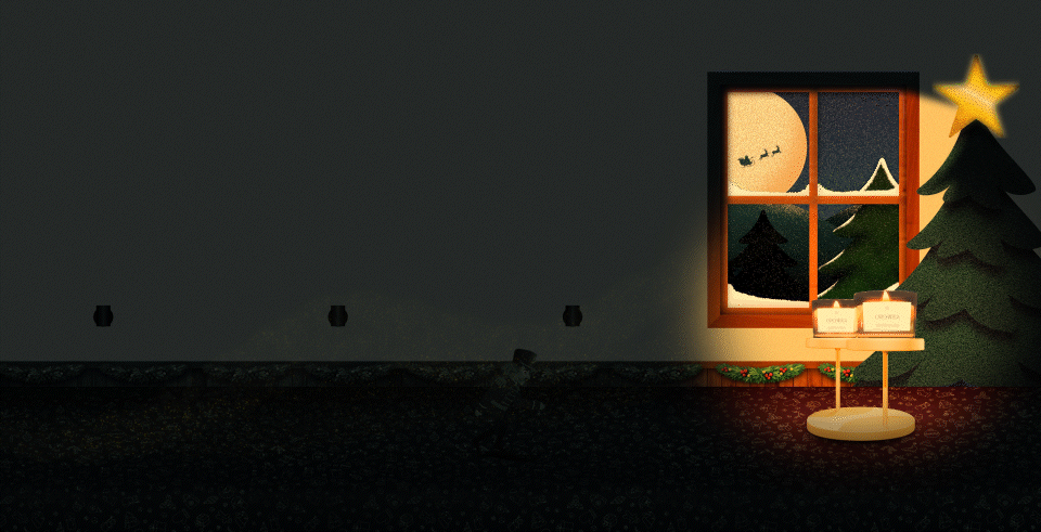 To support the cozy mood, I built a stylized environment with strong Christmas cues, but always keeping the scene clean enough for readability and motion. I designed two lighting versions of the same set (light and dark), choosing the dark version as the main look so the highlights could live only where it matters: the path lamps and the candle glow. This contrast helped guide attention and made the final reveal feel warmer and more impactful.